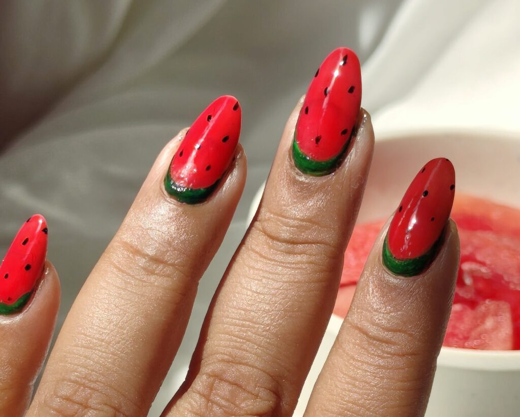 Juicy fruits are one of my favourite things about summer. And I love me a matching refreshing nailart! Try watermelon nails with a red base, green tips, and tiny black seeds for a fun, refreshing look. If you prefer something more subtle, cucumber-inspired nails with soft green tones and translucent details create a cool, spa-like effect. Both designs are easy to recreate and perfect for summer