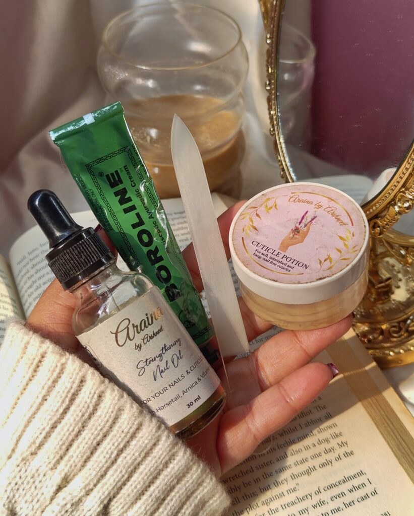 4. Oil your nails : Nail care is as important as any other form of selfcare, and just make it your routine to oil your nails 1-2 time(s) a day. You can also use a cuticle butter everyday, it is recommended. More details below.